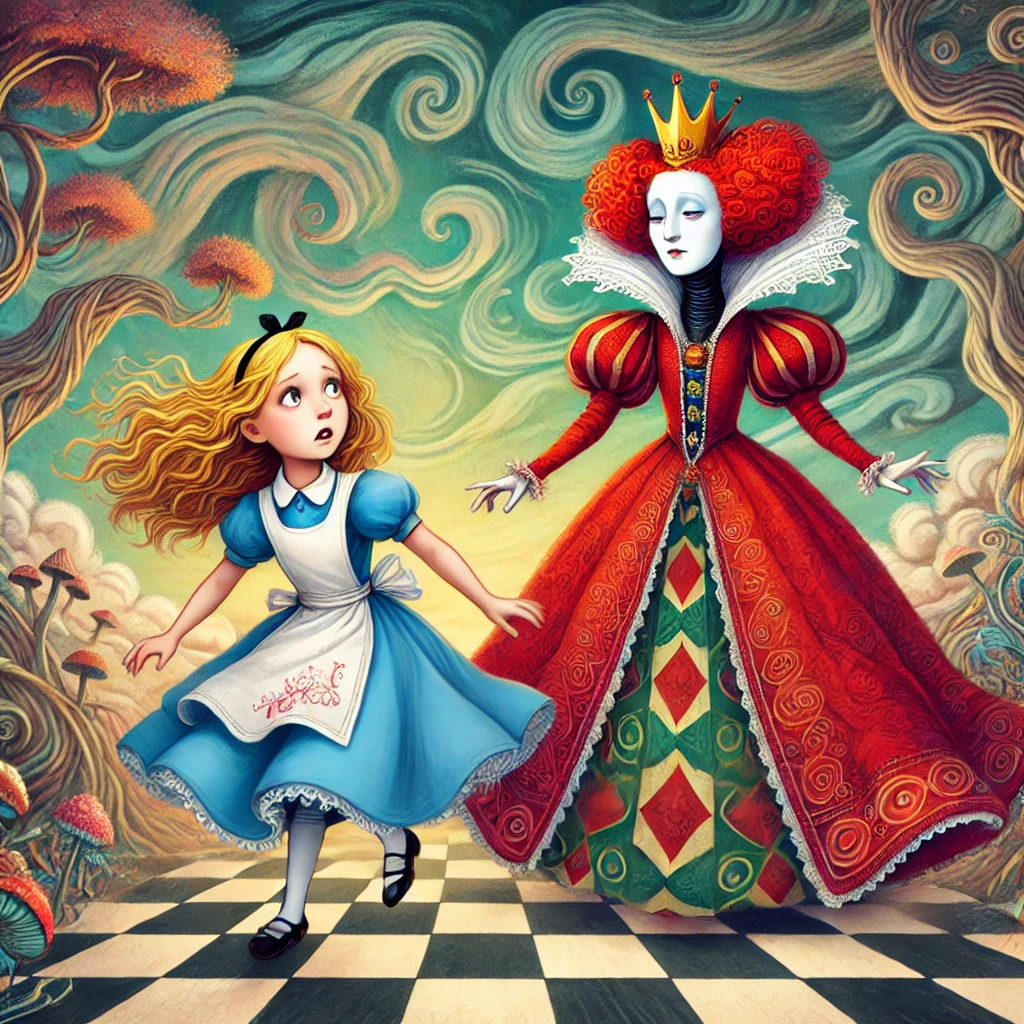 “Alicia y la Reina Roja corren rápidamente mientras van cogidas de la mano. Al final de esta escena, la joven se detiene extenuada y confusa ante el hecho de notar que el esfuerzo no le ha servido para avanzar pues sigue en el mismo lugar. Alicia sorprendida dice que en su mundo “cuando uno corre suele llegar a alguna parte”.